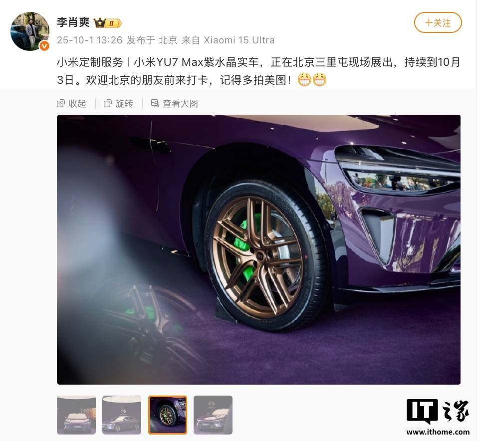 IT之家 10 月 1 日消息,雷军在 9 月 25 日的 2025 年度演讲活动中正式推出独特的“小米定制服务”,小米汽车副总裁李肖爽今天发布微博,透露相应定制服务中的小米 YU7 Max“紫水晶”配色实车现已在北京三里屯现场展出,持续至 10 月 3 日结束。