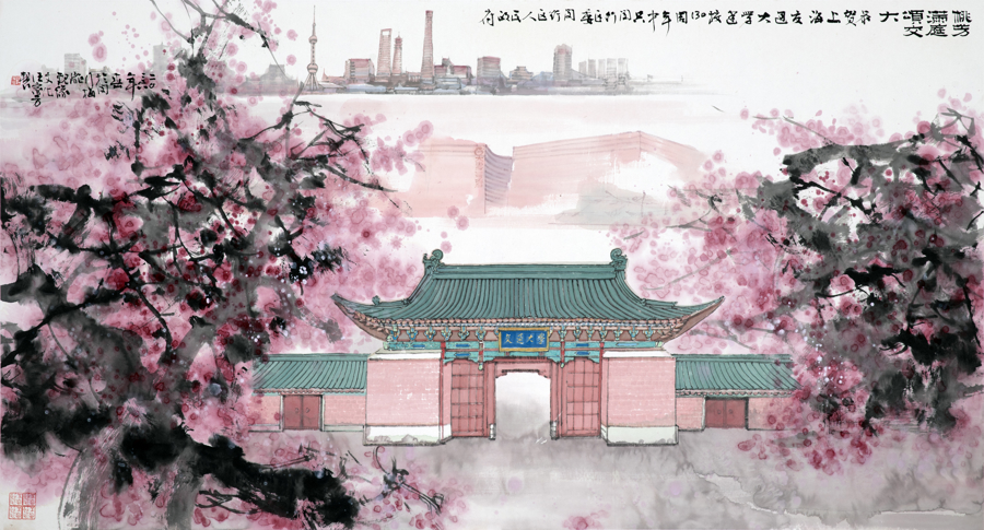 《桃芳满庭颂交大》由中国美术家协会理事、一级美术师汪家芳创作,画心尺寸180×97厘米。作品以传统国画为载体,将上海交大标志性校门、盛放桃花、大零号湾科创地标与上海城市天际线融为一体,既镌刻百年学府的深厚底蕴,也勾勒出城区蓬勃向上的时代气象。